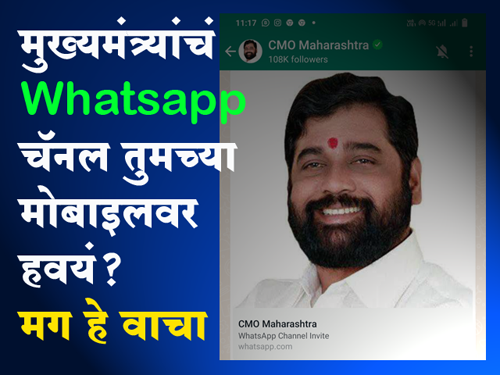 चॅनेलला असे करा फॉलो : व्हॉटस ॲपवरील ‘अपडेट्स’ मेनूमध्ये गेल्यावर तिथे चॅनेल सेक्शन असून तिथे ‘Find channels’ मध्ये ‘CMO Maharashtra’ हे टाइप केल्यावर चॅनेलच्या यादीमध्ये हे प्रमाणित चॅनेल दिसेल, त्याला क्लिक करुन फॉलो केले की तुम्हाला सर्व अपडेट्स विनासायास उपलब्ध होणार आहेत. https://whatsapp.com/channel/0029Va4FQfl72WTydH1lnP3h या लिंकवर व्हॉटसॲपधारकांनी क्लिक केल्यास ‘CMO Maharashtra’ चॅनेलला फॉलो करता येणार आहे.