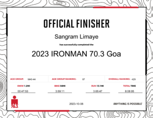 खरंतर यावर्षीची रेस मागच्या वर्षीपेक्षा अधिक कठिण होती. कारण यावर्षी सायकलिंगमध्ये जास्त चढाव असणारा रूट होता. 90 किलोमीटर अंतर पार करत असताना सातशे मीटरपेक्षा जास्त चढावाची उंची गाठायची होती. म्हणजे जवळजवळ सव्वा दोनशे मजल्या एवढ्या उंचीची इमारत सायकलवर चढून जायचे व त्याची लांबी 90 किलोमीटर असेल इतका कठीण सायकलिंगचा रूट होता. मागच्या वर्षी नोव्हेंबरमध्ये असणारी शर्यत यावर्षी ऑक्टोबरमध्ये होती. त्यामुळे ऑक्टोबर हीटचा सामना करत गोव्याच्या प्रचंड ह्युमिडिटीमध्ये रेस करणे तसे अवघडच होते. यावेळेस गोव्यातील वातावरण एवढे कठीण होते की, रेसच्या दरम्यान एका 26 वर्षीय तरुणाचा डीहायड्रेशनने मृत्यू देखील झाला. बऱ्याचशा पार्टिसिपंटला क्रॅम्पिंग येऊन ते रेस पूर्ण करू शकले नाहीत. पण कुटुंबीयासकट इतर सर्वांनी दिलेली साथ, शास्त्रशुद्ध केलेला सराव या सगळ्याच्या जोरावर मी ‘कॉमन मॅन’ ते ‘आयर्न मॅन’ हा प्रवास पूर्ण करू शकलो. ठरवल्याप्रमाणे रेसच्या फिनिश लाईनला मी फिजिकली परिपूर्ण फिट अवस्थेमध्ये पोहोचलो. मला कुठल्याही प्रकारे क्रॅम्पिंग किंवा ईतर त्रास झाला नाही. रेस संपल्यानंतर देखील मला कुठल्याही आधाराची गरज लागली नाही. मी अगदी सहज एक किलोमीटर चालत माझ्या हॉटेलच्या रूम पर्यंत पोहोचलो.  दुसऱ्या दिवशी स्वतः गाडी चालवून गोवा ते कोल्हापूर आलो व तिथून ड्रायव्हरने सलग 16 तास प्रवास करून धुळ्यापर्यंत आणले. या सगळ्या काळात मला कुठल्याही विश्रांतीची तेवढी आवश्यकता भासली नाही.  हे सर्व साध्य झाले ते केवळ सराव, आहार व अतिशय काटेकोरपणे शिस्त पाळल्यामुळेच.
