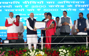 लखपती दीदींचा प्रधानमंत्री मोदी यांच्याकडून सन्मान : दरम्यान, आजच्या कार्यक्रमात महाराष्ट्रातील वंदना पाटील, मनीषा जगताप, ज्योती तागडे, सीमा कांबळे, रमा ठाकूर यांच्यासह शीतल नारेट (हिमाचल प्रदेश), महबूबा अख्तर (जम्मू काश्मीर), गंगा अहिरवार (मध्य प्रदेश), एस. कृष्णावेण्णी (तेलंगणा) आणि नीरज देवी (उत्तर प्रदेश), सेरिंग डोलकर (लडाख) यांना यावेळी प्रधानमंत्री श्री. मोदी यांच्या हस्ते लखपती दीदी झाल्याबद्दल सन्मानपत्र देण्यात आले.