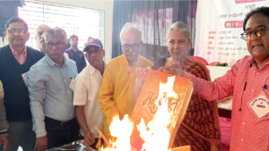 धुळे : राष्ट्रीय शिक्षण धोरणाची पोलखोल करण्यासाठी धुळे येथे संत रविदास गार्डनमध्ये शिक्षण बचाव परिषद आयोजित करण्यात आली होती. मध्यप्रदेशातील जागृत आदिवासी महिला संघटनेच्या नेत्या माधुरी ब्रिजभूषण यांच्या हस्ते मनुस्मृतीचे दहन करून परिषदेचा शुभारंभ करण्यात आला. डॉ. उमेश बगाडे यांच्या अध्यक्षतेखाली झालेल्या शुभारंभ सत्रात रमेश बिजेकर, कॉ. किशोर जाधव उपस्थित होते.